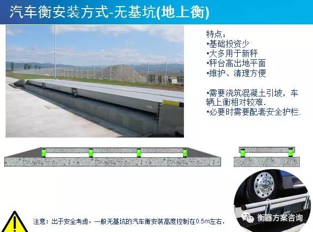 無基坑注意事項:需要澆筑混凝土引坡,車輛上衡相對較難.必要時需要配套安全護欄。出于安全考慮,一般無基坑的汽車衡安裝高度控制在0.5m左右。